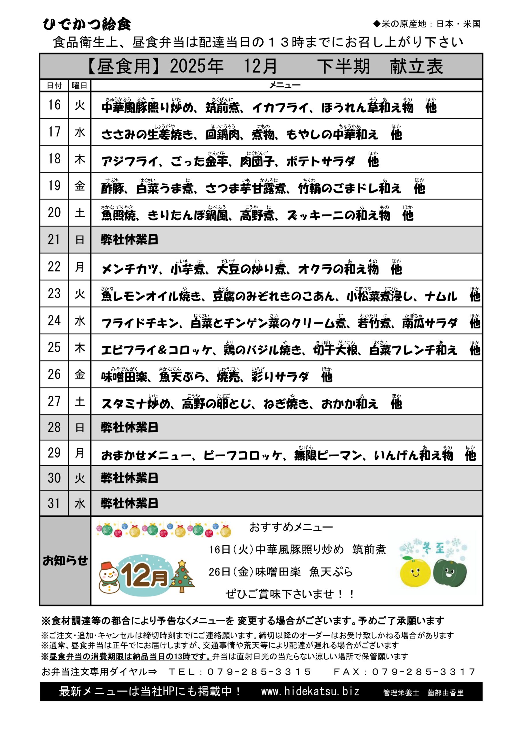 - こちらに掲載しているメニューは一般企業・障がい者施設向けとなります。デイサービス・シニアマンション向けのメニューをご希望される場合は、弊社までご連絡ください。